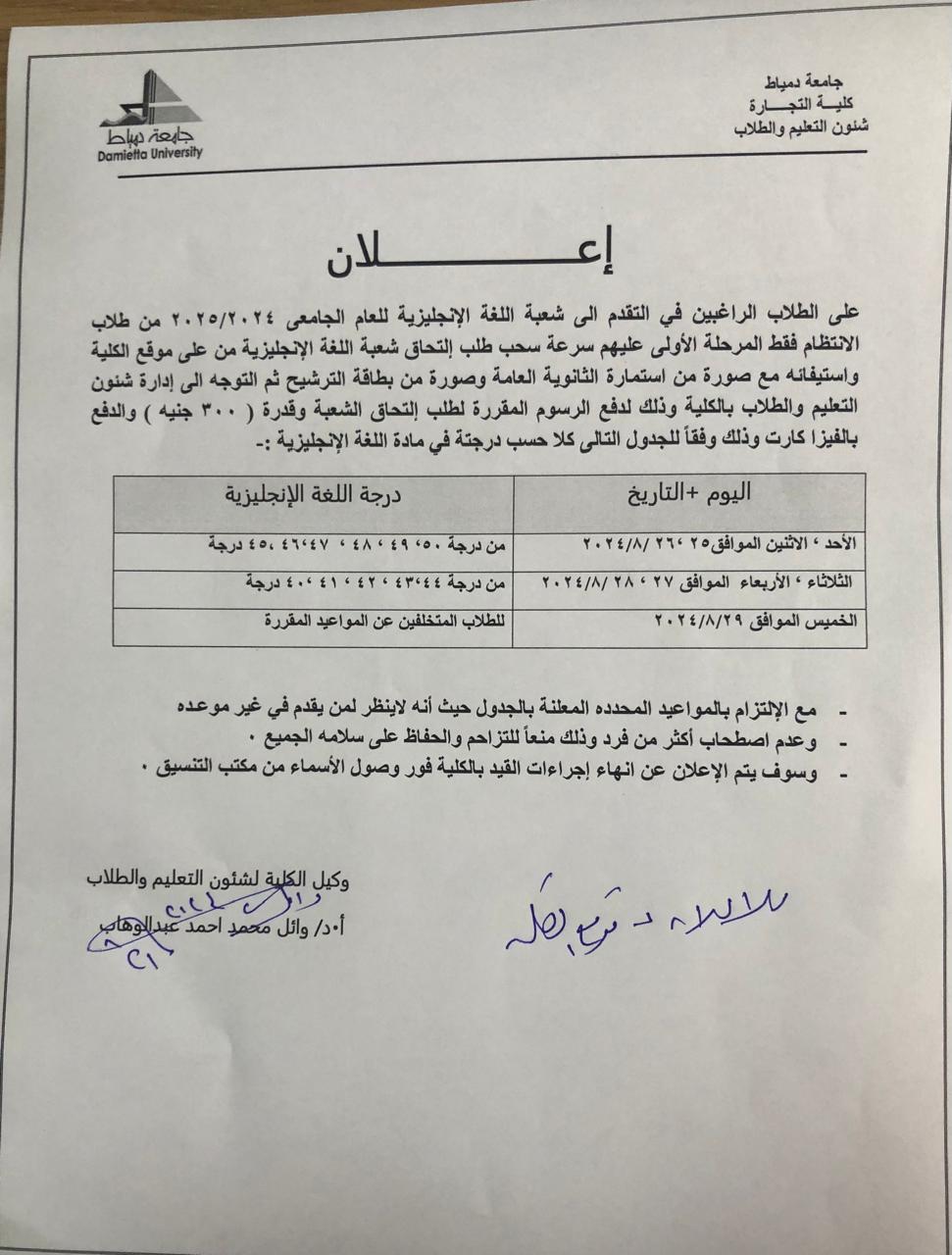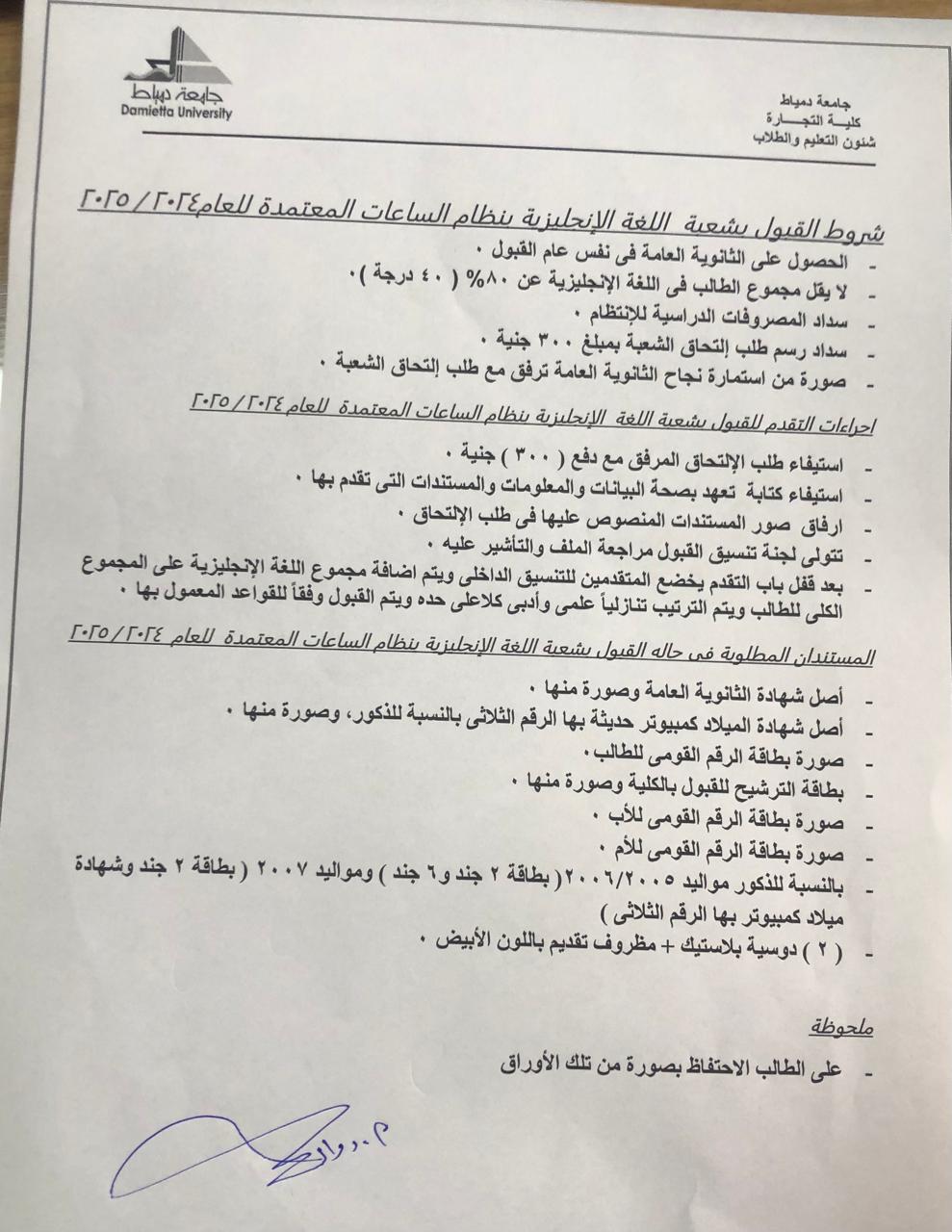 واستيفائه مع صورة من استمارة الثانوية العامة وصورة من بطاقة الترشيح ثم التوجه إلى قسم إدارة شئون التعليم والطلاب بالكلية وذلك لدفع الرسوم المقررة لطلب إلتحاق الشعبة حسب درجة الطالب فى مادة اللغة الانجليزية .